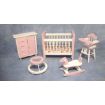 A lovely 1/12th scale five piece pink and white nursery set consisting of a highly detailed crib, high chair, walker, chest of drawers and a fantastic rocking horse.