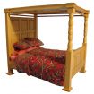 <p>This luxury pine coloured four poster bed comes with red sheets.</p>