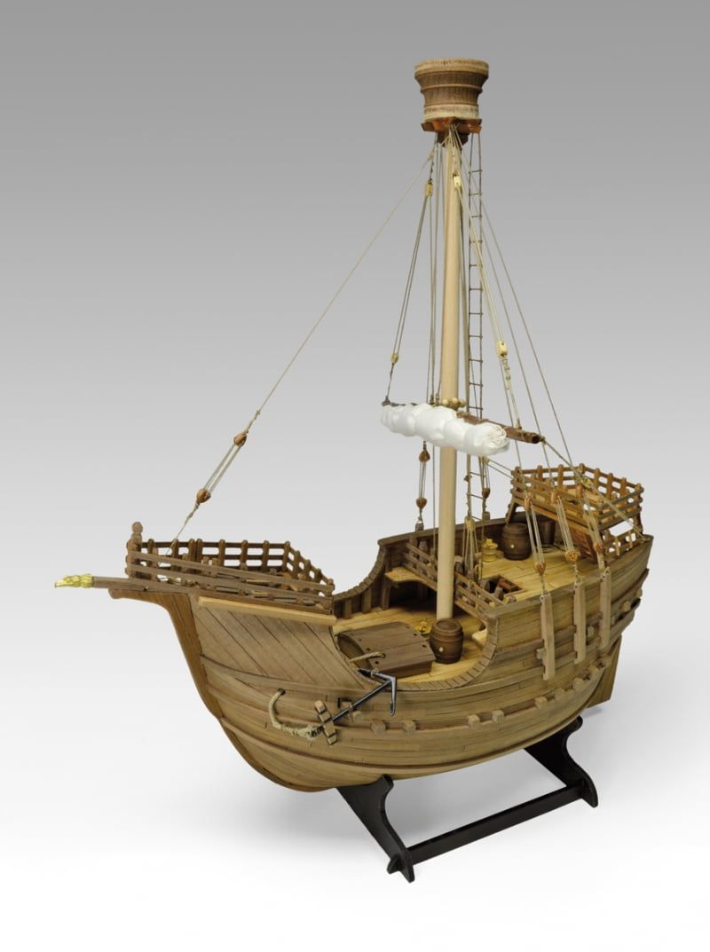 The carrack, or Spanish coca, is a type of ship built in the XV century and it was widely used as merchant ship. It generally featured two castles, one at stem and one at stern, in order to defend the load from pirate attacks. From the top placed on the long mast, sailors could easily monitor the sea. This ship had a unique appearance with its mast almost as long as the hull and with the round and large hold.