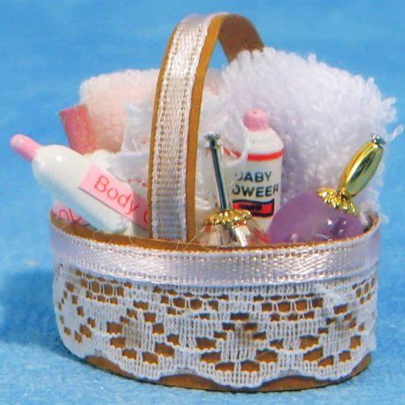 A basket of dolls house toiletries ideal for any 12th scale bathroom.