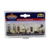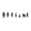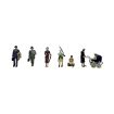 Figure 1 – Male mid 40s going to work, dressed in a smart two-piece suit, raincoat draped over arm, standing waiting for the train. Figure 2 – Male mid 40s going to work, carrying brief case and newspaper, frantically running for the train. Figure 3 – Female early 30s in smart suit and hat, carrying handbag and umbrella. Figure 4 – Boy 12-14 years in shorts, standing holding fishing rod and bottle of ginger beer. Figure 5 – Boy aged about 10, sitting resting on a wicker picnic hamper, reading a comic. (Accessory included). Figure 6 – Smartly dressed female, early 30s, in long coat and hat, carrying handbag, pushing pram looking at baby. Figure 7 – Baby figure for the period pram.