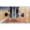 The rack & pinion blade guard design is adjusted by using a dial on the side of the machine. The blade is then guided by two side facing bearings and a rear thrust bearing attached to the end of the guard. The side bearings are mounted on an eccentric cam, for faster setting, and can be adjusted without using any tools. The same guide set up is repeated below the table giving maximum blade control and keeping the blade true when a straight cut is required.