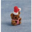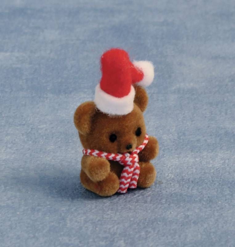 Adorable, fuzzy miniature bear wearing a Christmas hat - perfect for adding festive spirit to any room in your dolls house or adding extra decoration under your miniature Christmas tree.