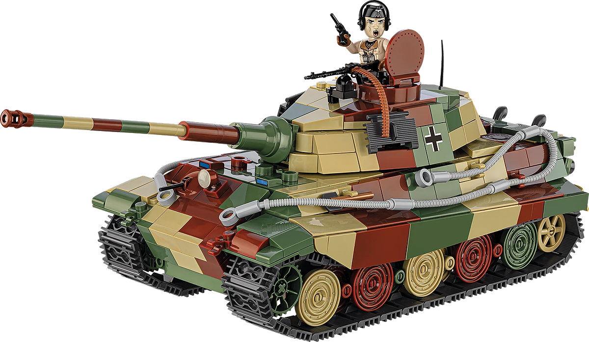 <p>The Tiger II, also known as the Königstiger (colloquially the King's Tiger), was a German heavy tank used during World War II. For the first time in the COBI offer, the largest tiger was designed in a scale of 1:35 and received a colourful camouflage characteristic of the final period of the war. The model has movable wheels, working tracks, a rotating turret with a movable cannon, a hatch in which you can place a figure, a removable engine and many other details!<br /><br />PANZERKAMPFWAGEN VI Ausf. tanks. B "KONIGSTIGER" were introduced into service in 1944 and was one of the most powerful tanks of its time. The Tiger II combined thick armour, reaching up to 180mm on the front of the hull, with a powerful 88mm KwK 43 L/71 gun, which made it a formidable opponent on the battlefield. Its weight was about 70 tons. The Maybach HL230 P30 engine with a power of 700 HP allowed it to reach speeds of up to 38km/h on the road. Despite its impressive combat performance, the Tiger II had numerous technical problems, including frequent engine and chassis failures. Its complex design and enormous resource consumption made production expensive and time-consuming. A total of approximately 492 units were produced. The Tiger II took part in many key battles, including the Battle of the Bulge and the fighting on the Eastern Front. Its presence on the battlefield had great psychological significance, but in practice, it was often limited by logistical and technical problems. Despite the flaws, the Tiger II remains one of the most famous and recognisable tanks of World War II.</p>