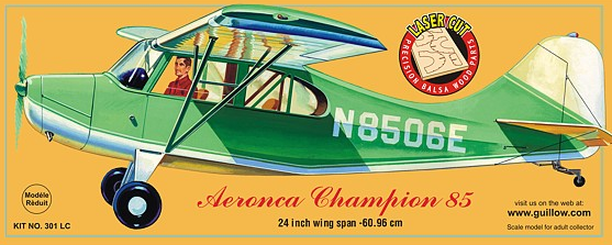 <p>Although the original manufacturer of the Aeronca Champion sold their business, their successor the Champion Aircraft Corp. produced many of this widely known personal airplane. Aeronca’s have been a common site on American airports for many years and rival the Piper Cub’s for popularity. Guillow’s scale model of the Champion 85 is designed to faithfully duplicate the many fine characteristics of this flyer.</p>
