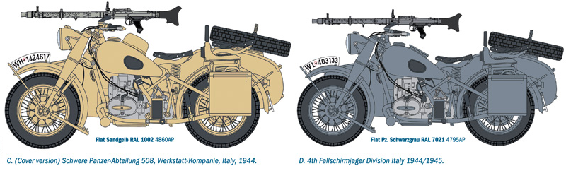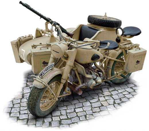 <p>In 1938, based on a specific request from the German army, BMW and Zundapp received the brief to start a co-joint development project to guarantee the highest number of common components, optimising the maintenance activities and spare parts logistics. The prototypes had been released in 1940 and the production started at the beginning of 1941. The side-car wheel was driven with an axle connected to the rear wheel of the motorcycle. This was fitted with a locking differential and selectable gear ratios to optimize the on-road / off-road performance. The twin-cylinder engine had a displacement of 750cc and was capable of delivering 26 HP. The BMW R75 was widely used on nearly all important operating theatres, and in all environmental conditions from North Africa to Russia. It repeatedly proved its reliability and sturdiness.</p>