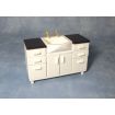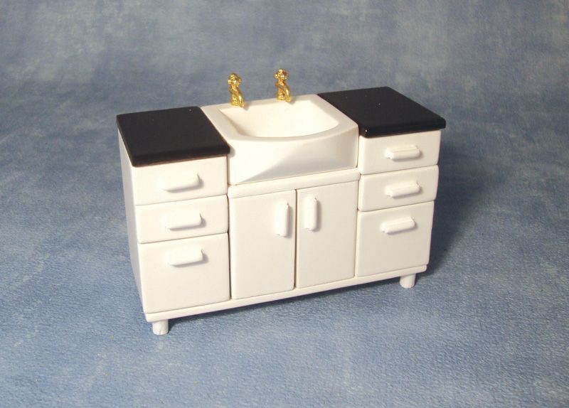<p>Modern dolls house bathroom sink unit with white painted finish, black top and brass taps and door knobs.</p>