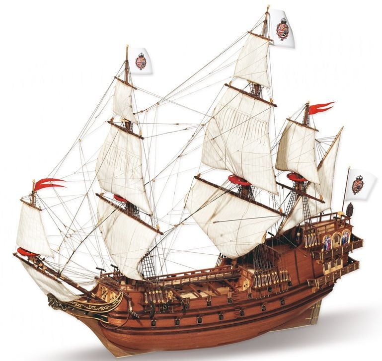 Ready-to-use boxwood blocks and deadeyes, 4 diameters of rigging, silk-screened flags and pennants, plus pre-sewn sails recreate the rig plan of the original galleon.