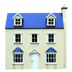 A two story house with hinged roof, attic, split front opening and bay windows. Cream and Pink versions have painted exterior walls, white windows and door.