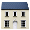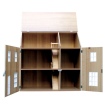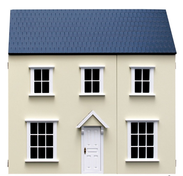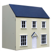 A two storey house with hinged roof, attic, split front opening and bay windows. Cream and Pink versions have painted exterior walls, white windows and door.
