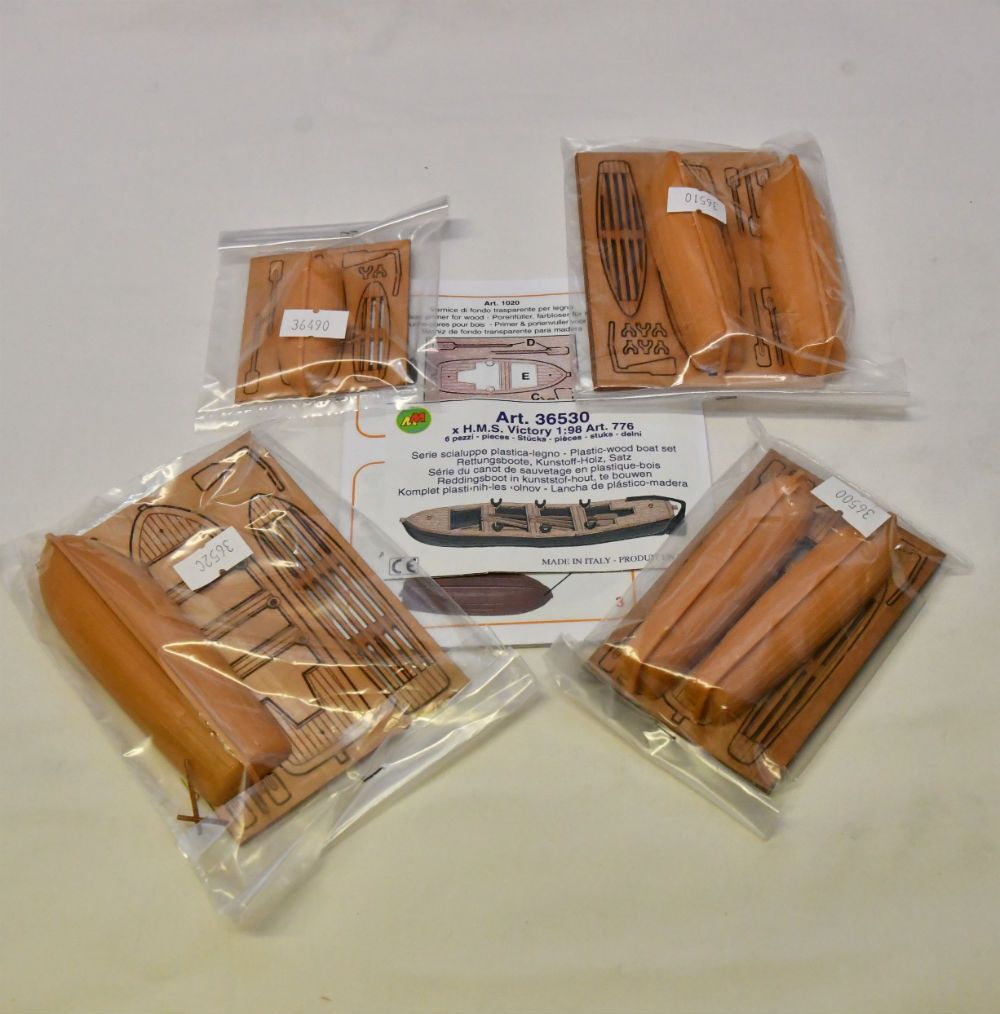 Set of 6 lifeboats for the 1:98 HMS Victory 776 with plastic hull and wooden interior. This new design has laser cut ply inserts and contains a complete oar set.