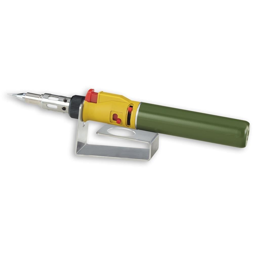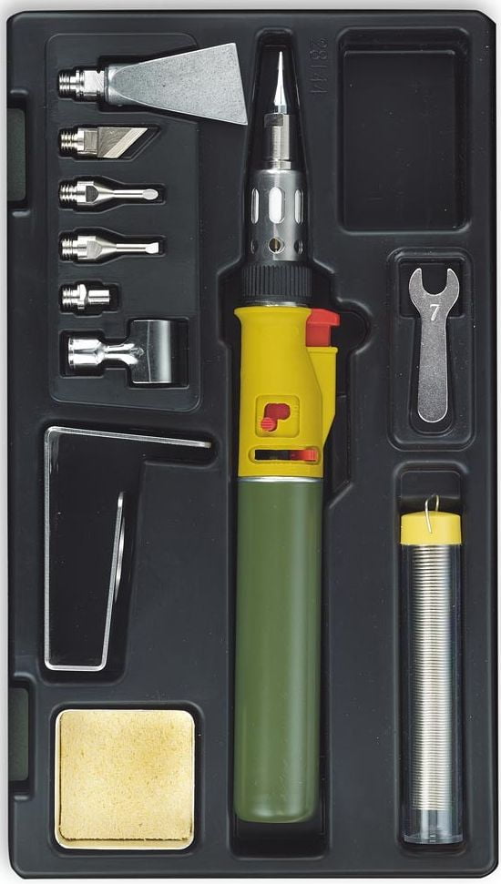 The MGS is capable of a wide variety of jobs with its seven different tips to choose from. Fuelled by butane, it is easy and cheap to refill from a standard lighter fuel cartridge. A relatively large reservoir allows a good working time. It has piezo ignition and a control for adjusting the gas/air supply. The MGS gives you the option of working with the catalyst unit in combination with a tip or with an open flame. For hard soldering with an open flame, it develops a temperature of 1,300°, with a soldering tip of 500°. The tips comprise a large wax/varnish-scraping knife for repairs in wood, a hot knife for cutting plastics, two wood burning pyrography tips, a soldering tip, a round nozzle for hot air work and a heat-shrinking nozzle. The set also includes solder, wiping sponge, spanner and a stainless steel rest/stand that allows you to set the MGS upright for stationary use. Supplied in a sturdy case with a polypropylene insert keeping everything neat and tidy.