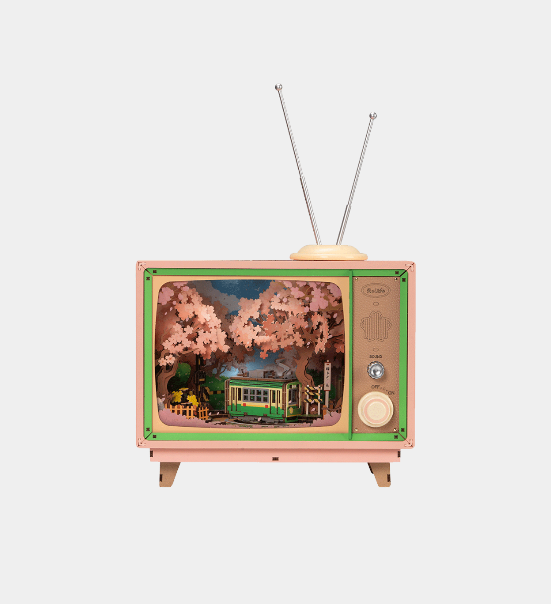 <p>Rolife blesses your days with peace and serenity through the sights and sounds of the Sakura Dreamy Tour wooden puzzle. Peer into the pastel-colored television set and be captivated by the gentle movement of a green Japanese train car on its springtime journey. In the background, you’ll find abundant pink cherry blossoms, the warm glow of amber lights, a clear blue sky, and the trill of soft music. Hum along to the graceful notes of Minuet in G Major or the uplifting melody of Jesu, Joy of Man’s Desiring. The old-school TV set frames the scene and gives off retro vibes with its cube shape, rabbit-ear antenna, and turning knob that adjusts the lights and music.</p>