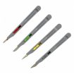 The set of 4 retractable precision safety knives are fitted with blade locking feature and are easily opened & closed using one hand. The different blade profiles are ideal for a variety of delicate cutting and trimming tasks. The profiles includes are colour coded as follows: Green #10, Grey #10A, Yellow #11, Red #15. The handles also includes a handy measuring scale.