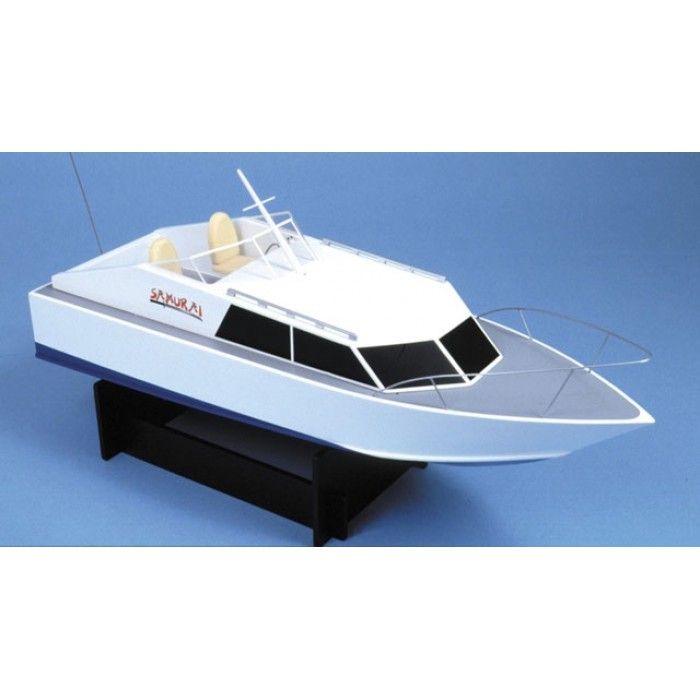The model itself is based on a typical "Deep Vee" offshore power cruiser, and has a fine performance in both smooth and rough conditions. Construction is all-wood, using accurately cut CNC router plywood. Also supplied in the kit is a pre-cut clear plastic cockpit screen, black self adhesive window decals, pulpit brass wire, boat stand, servo to rudder connection accessories and vac-formed cockpit seats.