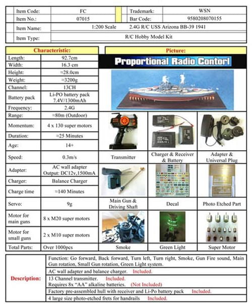 Also includes - 2.4GHz Transmitter, adapter, signal receiver, steering rudder, lipo battery, balance charger, smoke generator, smoke oil, dropper, socket wrench, cylindraceous wrench, horn, fastener (x3), screws, plugs (x4) and Servo (x2). 3-view colour painting guide with profiles and overhead plans for (2) ships - decals for hull marks, jack, ensign, admiral's pennant, signal flags and aircraft markings.