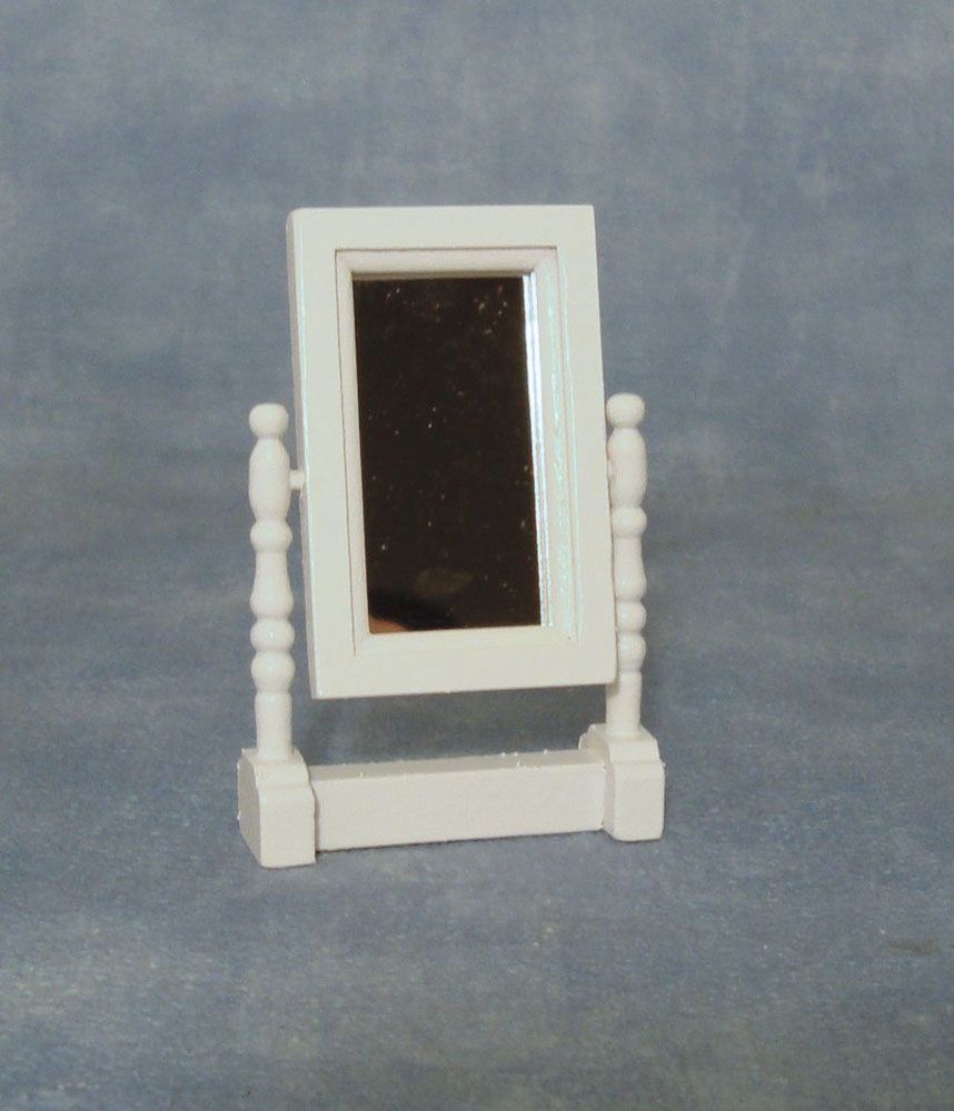 <p>This miniature swivel mirror is made of wood and has been painted white. It is perfect for a modern dolls house and can be used in the bedroom, on a dressing table or even in the bathroom.</p>
