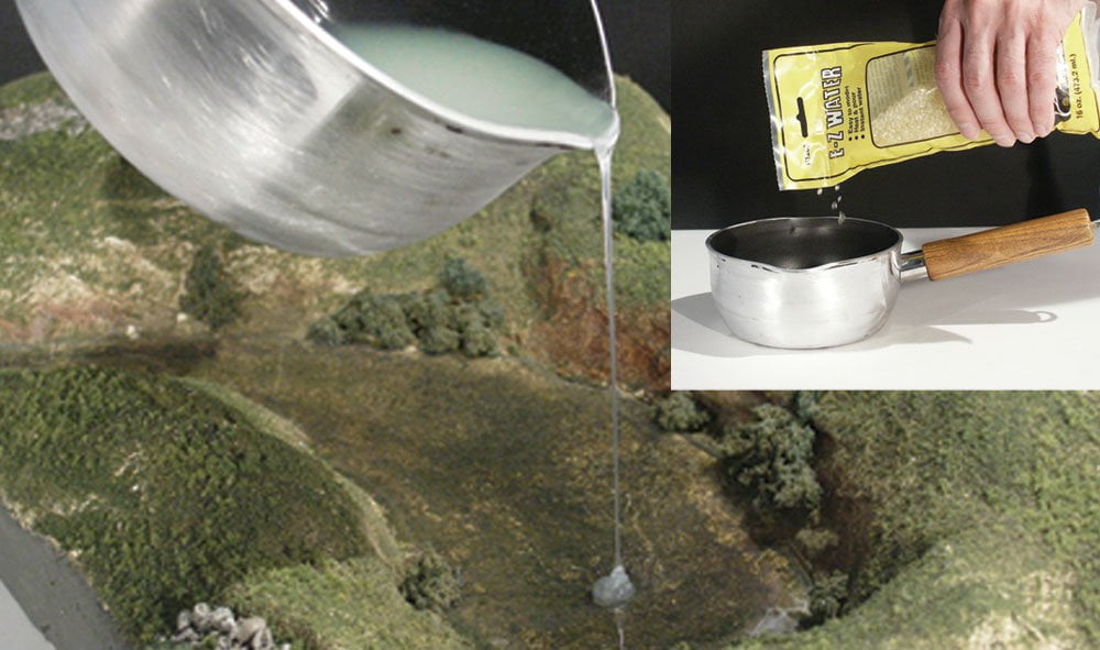Easy to use. Good for deep, single pours. No measuring or mixing. Just heat and pour E-Z Water according to package directions, to form ponds, streams, rivers and harbours. Non-toxic, low-odour product that hardens in minutes. Reheat with a heat gun to shape various accents, such as ripples, waves, rapids and to remove scratches. Contents cover 993cm2 (154 in2) when poured to a depth of 3mm (1/8 in) 473ml (16 fl oz)