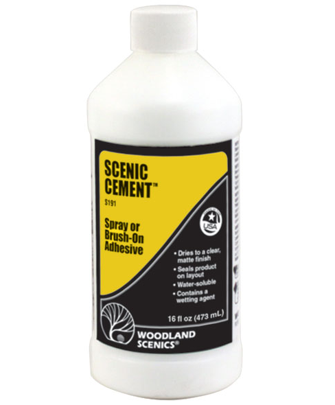 Scenic Cement is a ready-to-use spray or brush-on adhesive specially formulated to glue Ballast, Turf and other landscape materials to a layout. This multi-use product is non-toxic, water-based and dries to a matte finish. Scenic Cement contains a wetting agent that breaks surface tension, allowing easier and faster penetration of scenery materials for a strong bond and permeates instantly for maximum coverage. Apply with the Scenic Sprayer for a smooth, flowing application that reduces spray head clogging, foaming and bubbles
